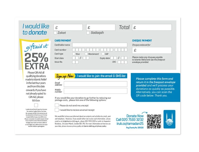 Leveraging Islamic Relief’s Ramadan branding, I designed a visually engaging and cohesive direct mail pack. This included an outer envelope, a double-sided letter, a dua book engagement piece, and a donation form featuring an online shop promotion on the reverse.
