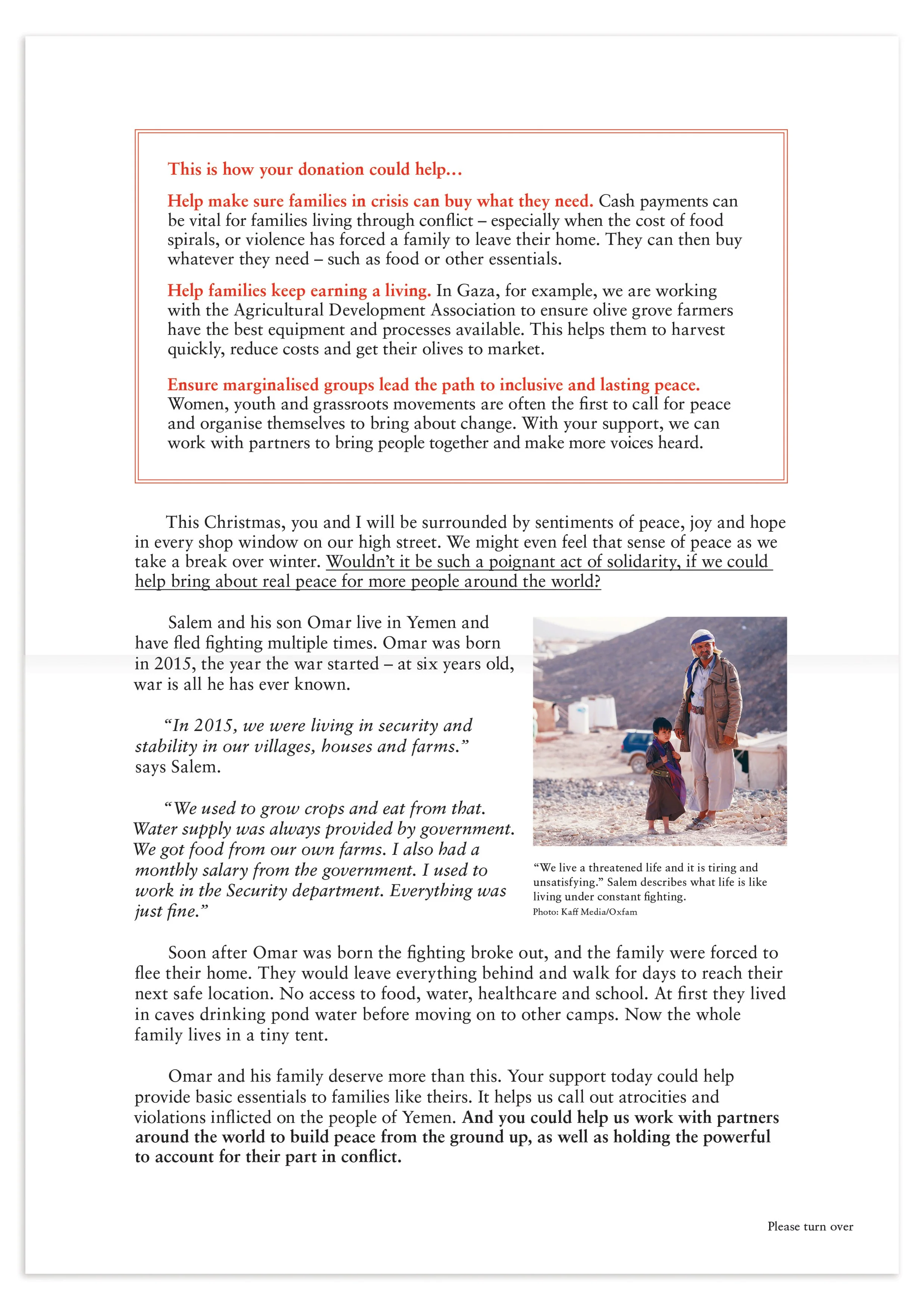 We navigated the challenging juxtaposition of Christmas joy and hard-hitting content by centering the pack around a theme of peace. Designed to feel personal, the pack featured a simple, greeting-card-style envelope and hand-crafted elements such as handwritten fonts, stamps, and a handwritten Christmas card (produced by Oxfam’s ethical and sustainable partner). The chosen stories struck a balance between need, community action, and hope.